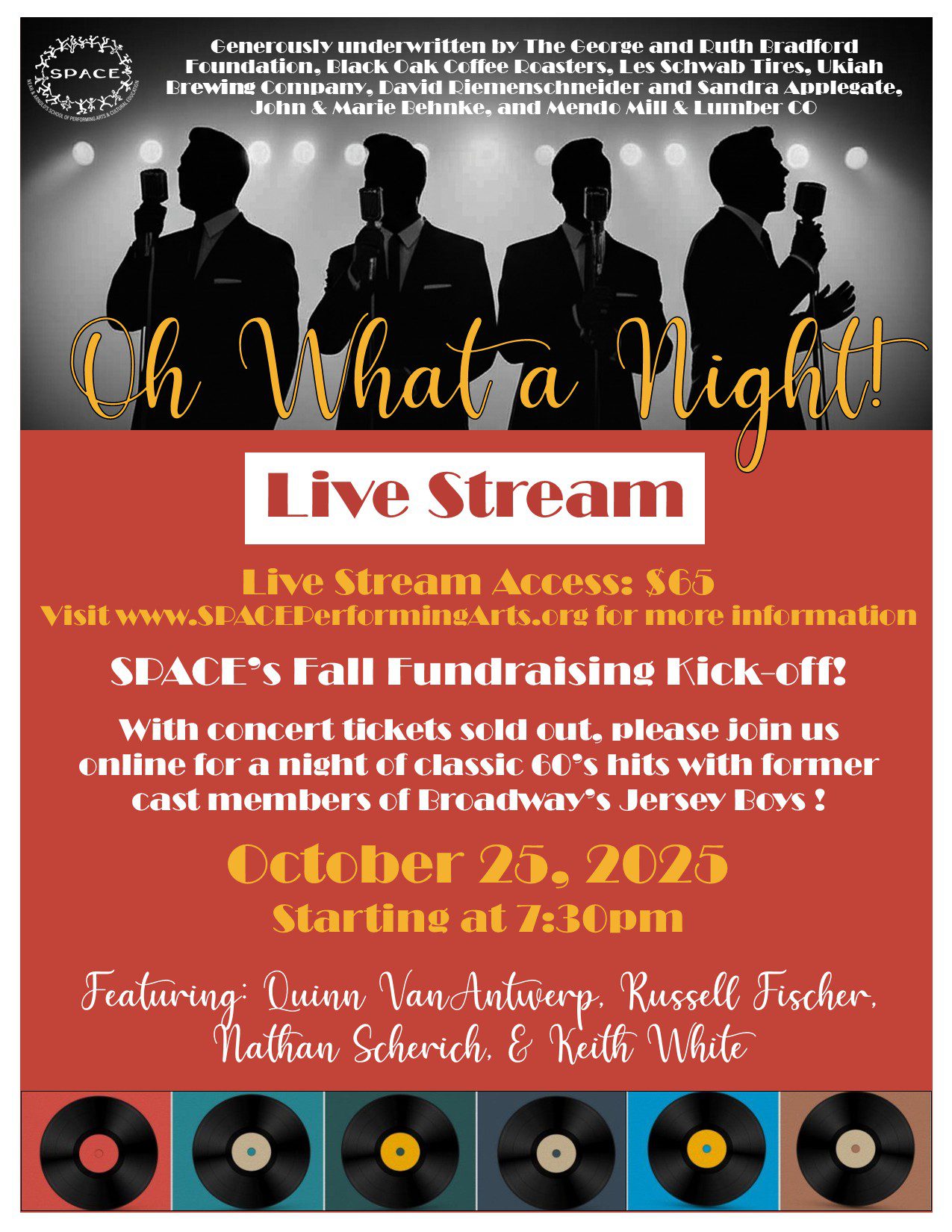 With in-person tickets sold out, SPACE is adding a live stream of this event. Join us via live stream on Saturday, October 25th at 7:30 as Ukiah’s own Quinn VanAntwerp, along with a cast of professional singers who previously starred in the Tony Award-winning Broadway production of Jersey Boys, take the stage for an unforgettable evening of music. Backed by a professional stage band, they’ll perform the iconic hits of Frankie Valli and The Four Seasons, as well as other beloved classics.